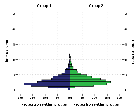 These cumulative plots aren't as problematic with bins as are the histograms or kde estimates, and in fact many interesting questions are much easier addressed with the cumulative plots. For instance if I wanted to know the proportion of events that happen within 10 days (or its complement, the proportion of events that do not yet occur within 10 days) this is an easy task with the cumulative plots. This would be at best extremely difficult to determine with the histogram or density estimates. The cumulative plot also gives a graphical comparisons of the distribution (although perhaps not as intuitive as the histogram or kde estimates). For instance it is easy to see the location of group 2 is slightly shifted to the right.