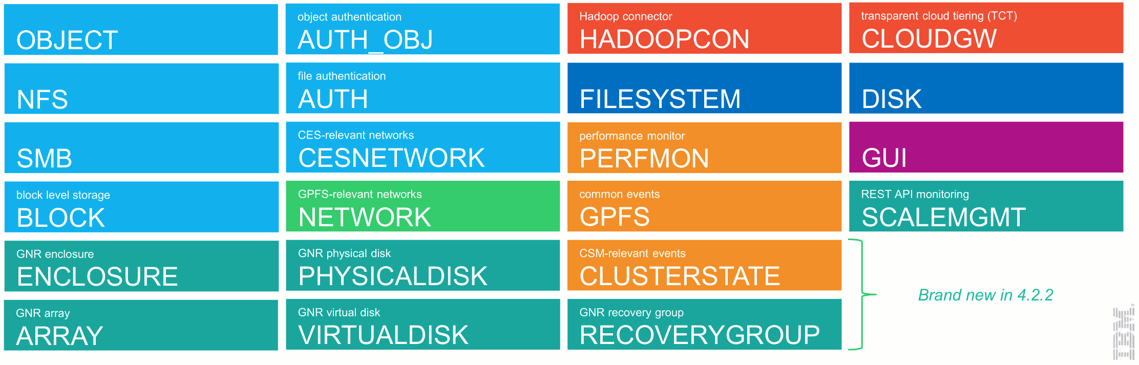 In IBM Spectrum Scale v 4.2.2 and later, the problem determination framework (available via the mmhealth command) was further extended to support in total 22 different system components (compared to 15 in v 4.2.1). It automatically performs over 150 different checks of the components functionality, generating over 500 different events for it.