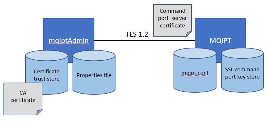 - Properties in the mqipt.conf configuration file containing the command port number, the name of the command port key store, the encrypted password to access the key store, and the certificate label of the command port certificate.