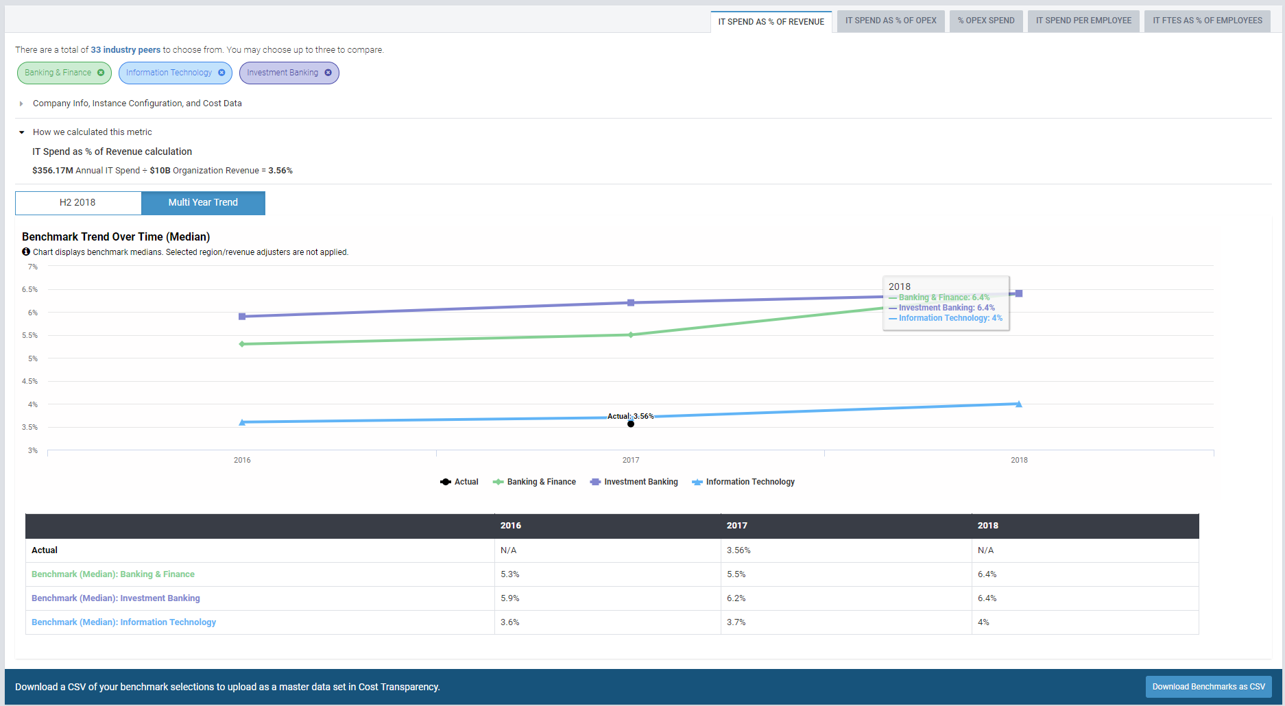 The screenshot above displays the median "IT Spend as a percentage of revenue industry" benchmark for the selected industries (in this case, Banking & Finance, Investment Banking and Information Technology) for the current benchmark year (2018), and prior two years (2017 and 2016). The benchmark is displayed in both chart and tabular forms.