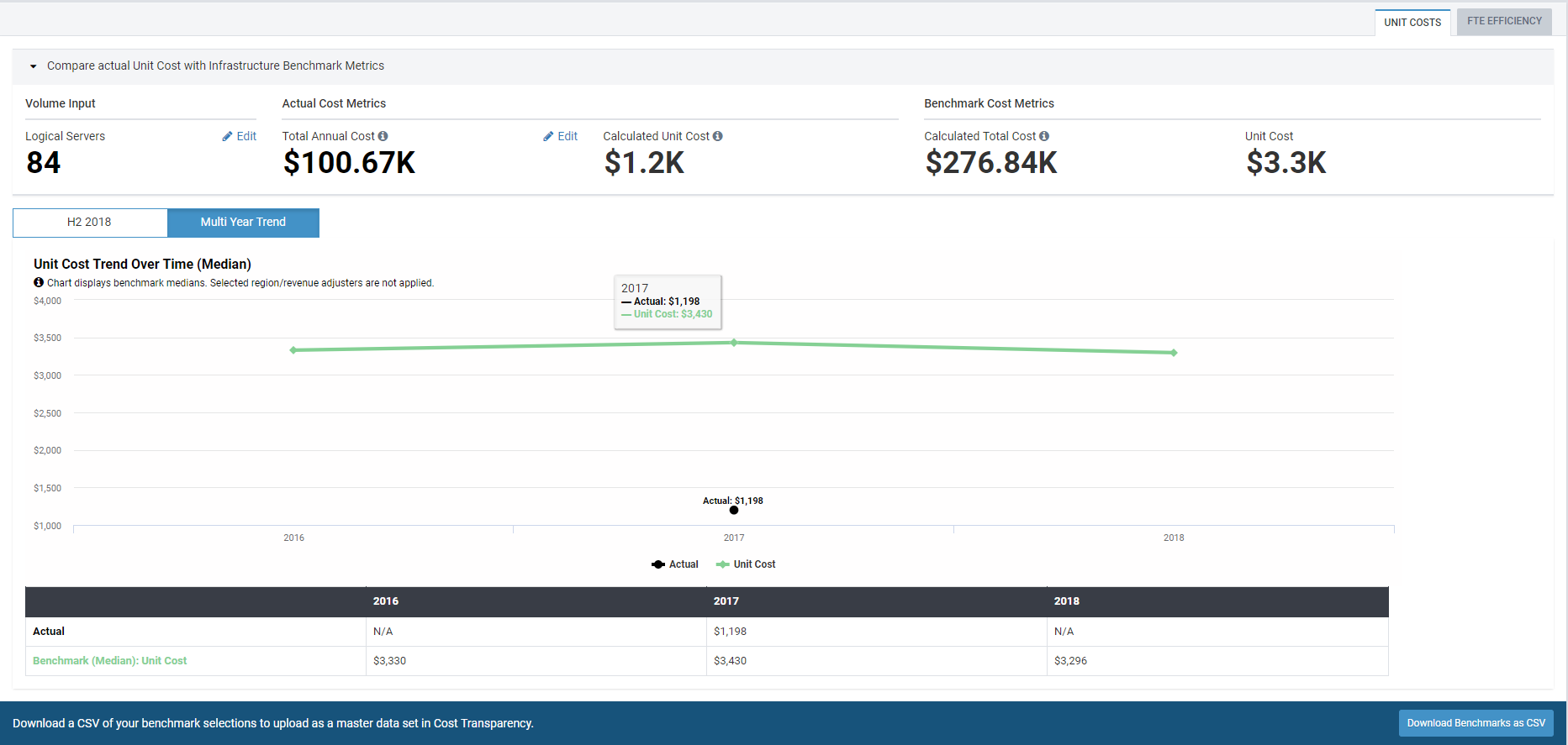 Use the multi-year trending feature in Interactive Benchmarking to compare your actuals against median benchmarks over a three-year time period. These three years include the current and prior two years. Trend over time is available for Industry Benchmark metrics and Infrastructure Benchmark metrics.